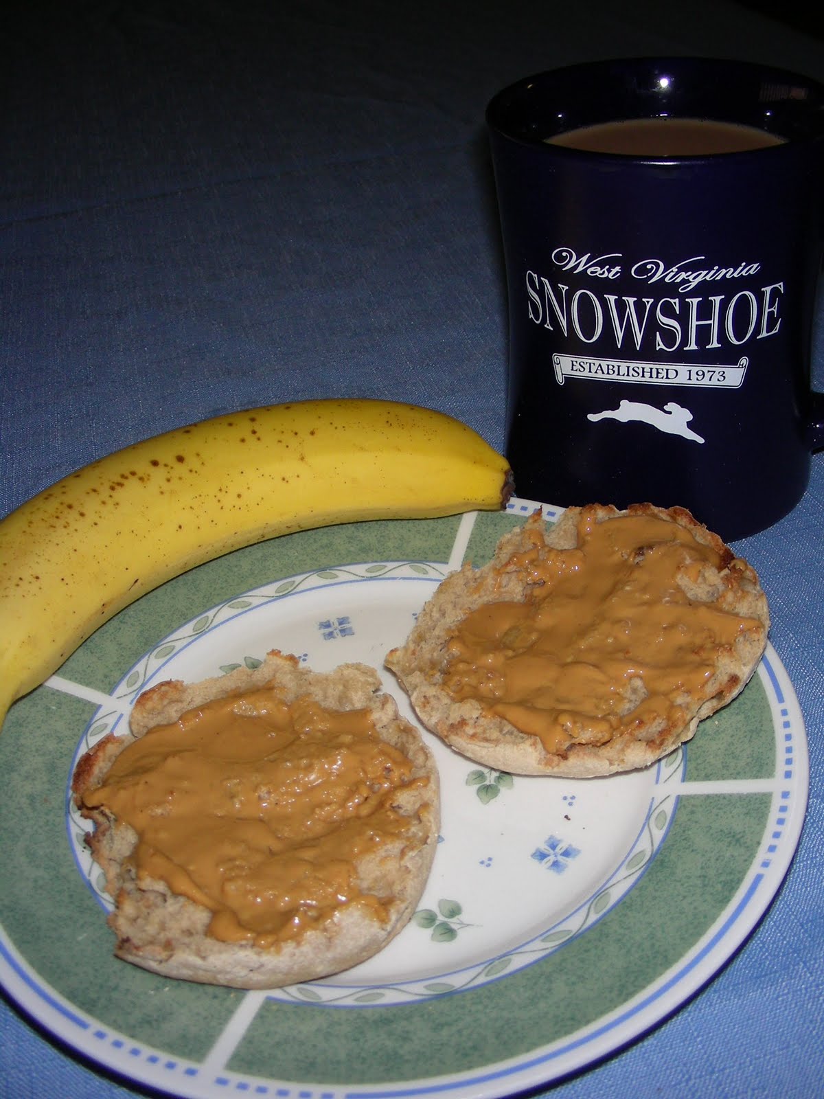 After my run I took a quick shower before my scrumptious breakfast of whole grain english muffins with organic peanut butter, a banana and, of course, a hot cup of joe!!!