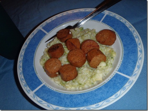 After the game, Jay and I tried a new recipe, Cheesy Zucchini Rice topped with Tofurky sausage. It was delicious, easy and really filling. It definitely hit the spot. Now we’re enjoying “How I met your Mother.”